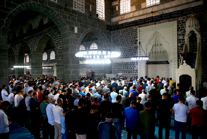 Diyarbakır’ın merkez Sur ilçesinde İslam aleminin 5. Harem-i Şerifi olarak bilinen Ulu Cami’de vatandaşlar, bayram namazı için saf tuttu.