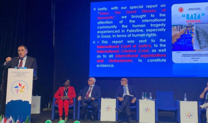 Engellemeye rağmen konuşmasını yapan Malkoç, ombudsmanların insan hakları ve temel özgürlüklerin korunması için çalıştığını, Gazze’de yaşanan insan hakları ihlallerine kayıtsız kalamayacaklarını, İsrail’in kadın, çocuk demeden masum sivillerin, ibadethanelerin, hastanelerin, okulların bombalamasının vicdanları yaraladığını belirtti.