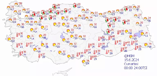 Meteoroloji Genel Müdürlüğü, 15 Haziran 2024 Cumartesi günü için hava durumu tahminlerini açıkladı.