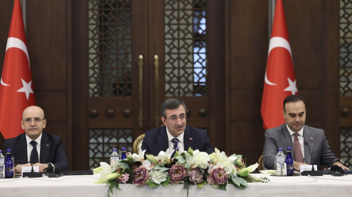 Cumhurbaşkanı Yardımcısı Cevdet Yılmaz, Cumhurbaşkanlığı Külliyesi’nde “Türkiye Yüzyılı Yatırım İçin Güçlü Merkez” basın toplantısına katıldı. Toplantıda, Hazine ve Maliye Bakanı Mehmet Şimşek, Sanayi ve Teknoloji Bakanı Mehmet Fatih Kacır, Ticaret Bakanı Ömer Bolat, Cumhurbaşkanlığı Strateji ve Bütçe Başkanı İbrahim Şenel, Cumhurbaşkanlığı Yatırım ve Finans Ofisi Başkanı Ahmet Burak Dağlıoğlu da yer aldı.